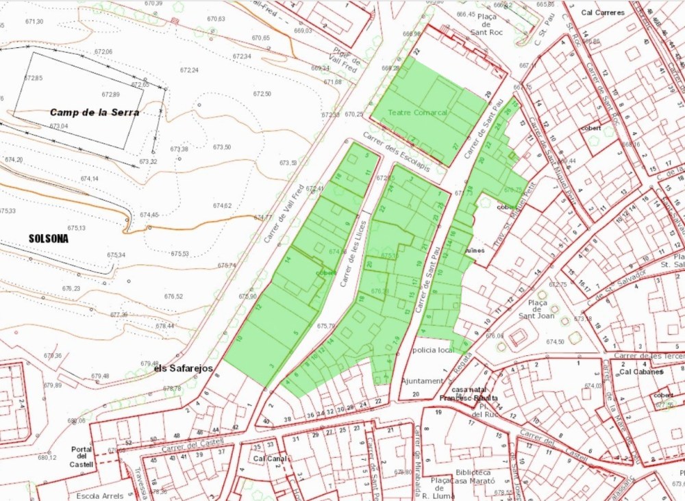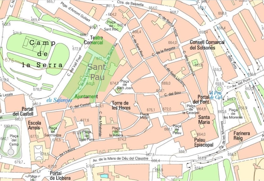 En aquest barri hi havia l’edifici dels Escolapis, que es va derruir per construir-hi un bloc de pisos i el Teatre Comarcal de Solsona. El carrer de Sant Pau era on hi havia l’antic call jueu i al carrer de les Llices era on se celebraven els jocs i torneigs medievals. El sant del carrer s’escau el dia 29 de juny, festivitat de Sant Pau. El barri està format per les cases de les següents adreces: