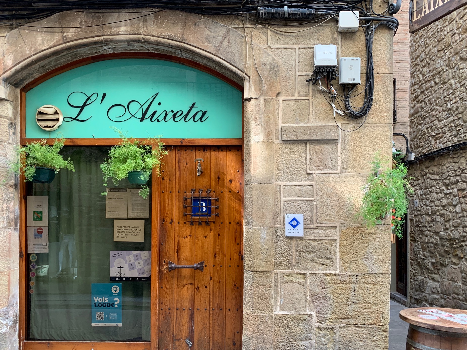 - Fotografia de la porta de l’Aixeta amb la placa de cal Llera