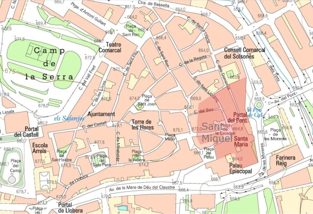 En aquest barri hi ha el portal del Pont i la plaça de la Catedral, com a indrets més emblemàtics de la vella Solsona. El sant del carrer se celebra el dia 29 de setembre, festivitat de Sant Miquel. El barri està format per les cases de les següents adreces: