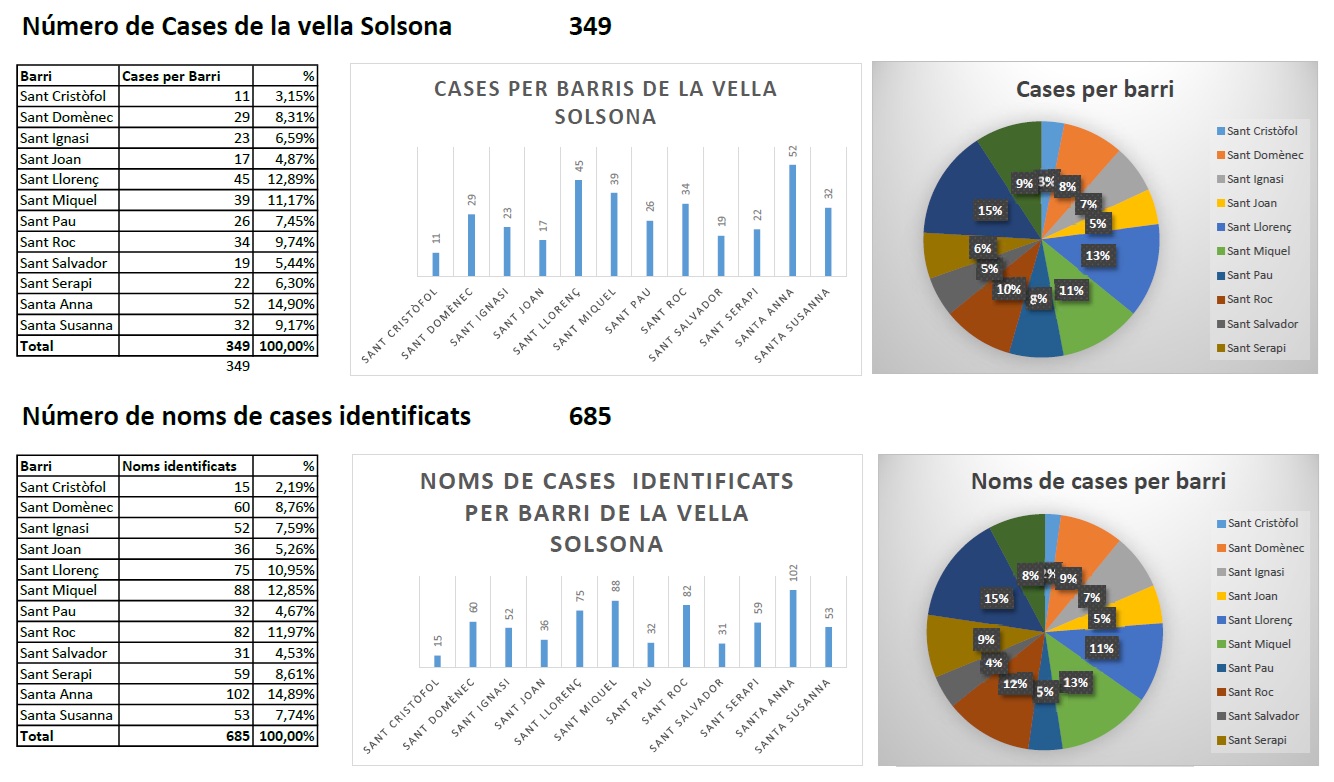 S’han identificat 349 cases o edificis a la vella Solsona, de les quals 45 ja no existeixen, 37 perquè han passat a formar part d’altres cases que les han integrat i 8 que han sigut substituïdes per places o per ampliacions de carrers.