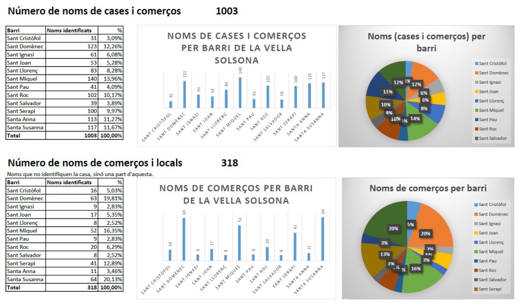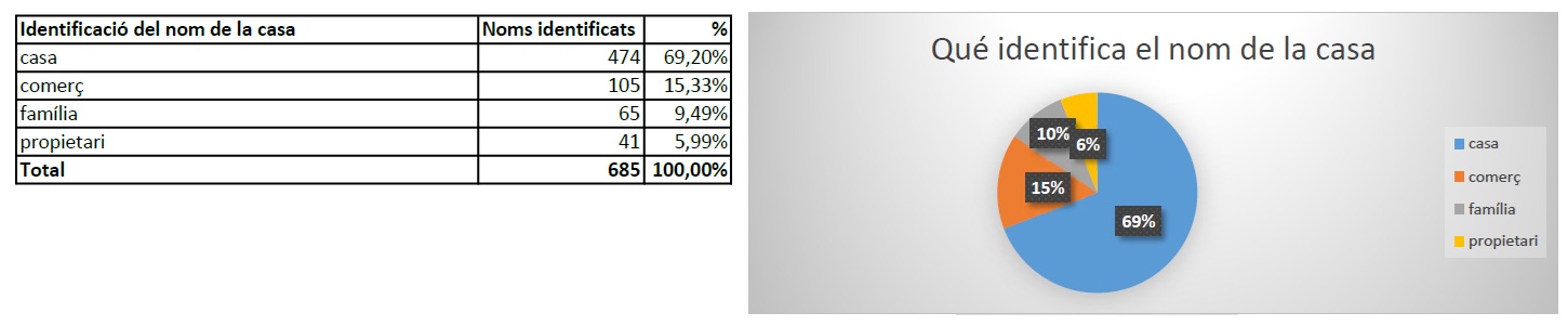 En total s’han identificat 1003 noms, des quals 685 es corresponen a noms de cases (són els que son objecte d’aquest estudi) i 318 són noms de locals i comerços que no identifiquen a la casa.