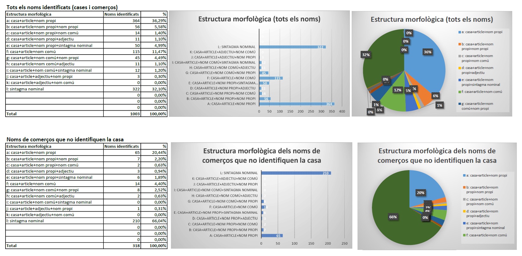 10. Estructura morfològica. Seguint Enric Moreu-Rey, es classifiquen les denominacions de les cases atenent a la seva morfologia estructural, cosa que es fa en tres quadres i gràfics: per a tots els noms recollits, per a totes les denominacions excloent-hi comerços i per al nom principal de cada casa.