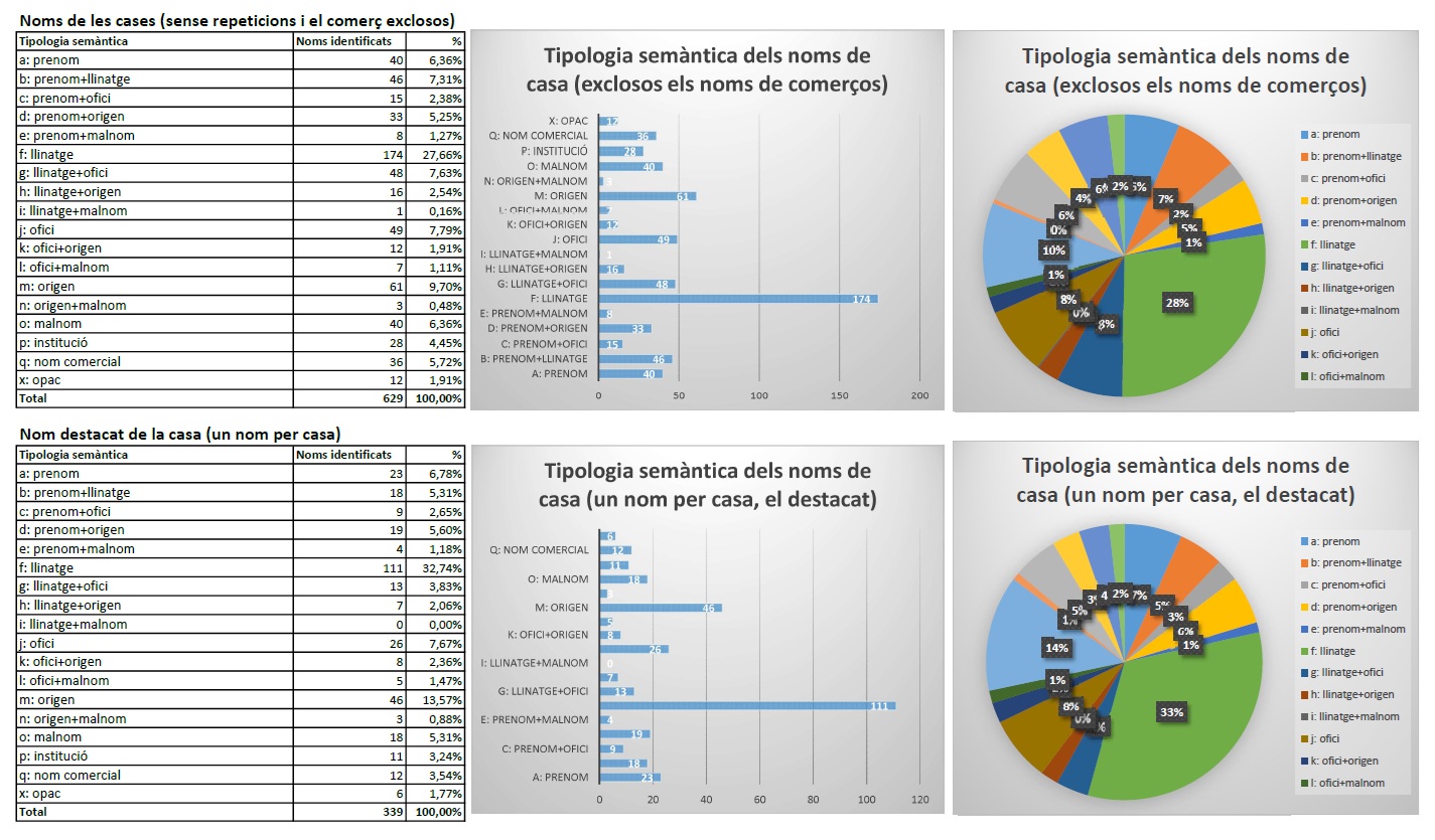 Hi ha una majoria aclaparadora de la variant casa + article + cognom (per ex.: cal Jalmar), en tots tres casos. Mentre que si un considera tots els noms (establiments comercials inclosos), pren rellevància la variant sintagma nominal (per ex.: barber Tripiana).