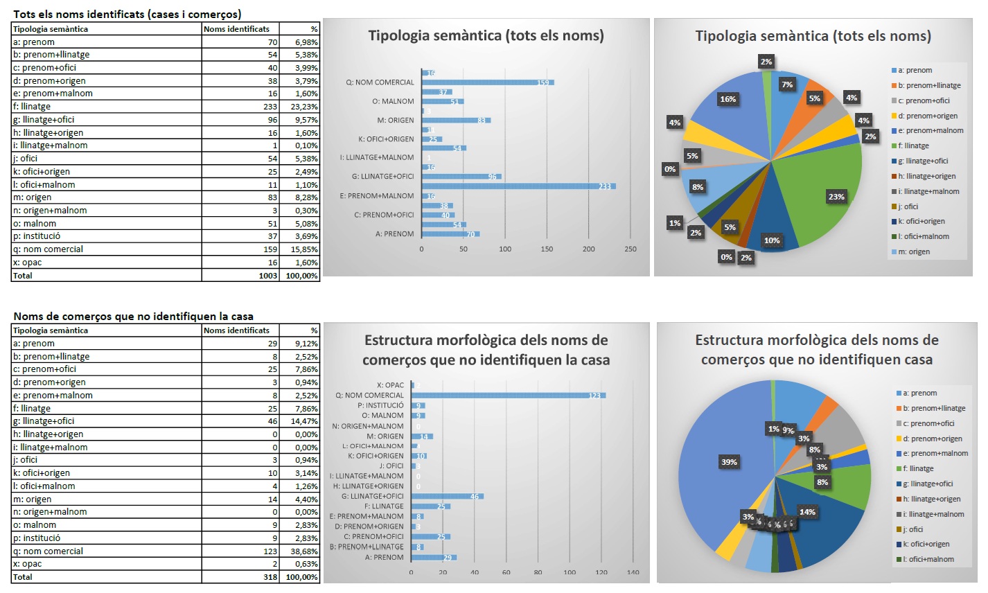 11. Tipologia semàntica. Aquí es classifiquen les denominacions de les cases atenent al seu origen, cosa que es fa, com a l’ítem anterior, també en tres quadres i sengles gràfics: per a tots els noms recollits, per a totes les denominacions menys comerços i per al nom principal de cada casa.
