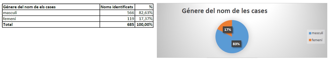 Hi ha gairebé una cinquena part de noms femenins, proporció a destacar si és compara amb l’àmbit rural, on són pràcticament inexistents.