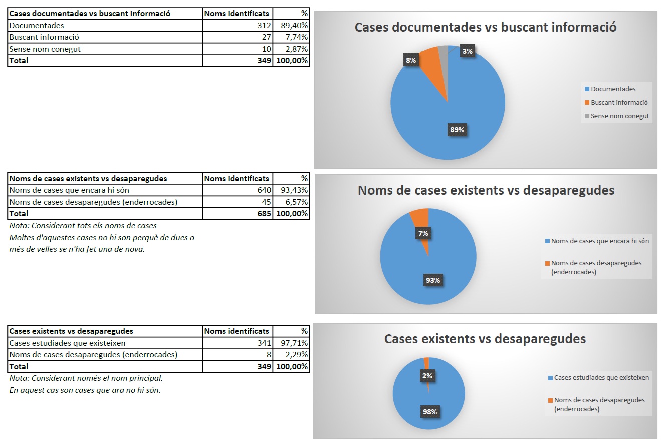 Hem aconseguit al menys un nom per a 339 d’aquestes cases, en mitjana 2 noms per casa, però encara ens en queden 10 sense nom conegut, de les quals continuem buscant informació.