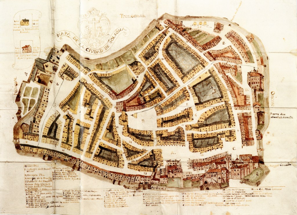 Mapa de la divisió de Solsona per jurisdiccions de l’Arxiu Ducal de Medinaceli, Atles de viles, ciutats i territoris de Lleida – 1743. Aquest mapa ajuda a entendre la denominació dels carrers que es va servir en els censos i padrons municipals de Solsona entre 1840 i 1870.